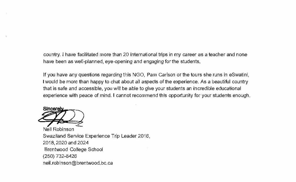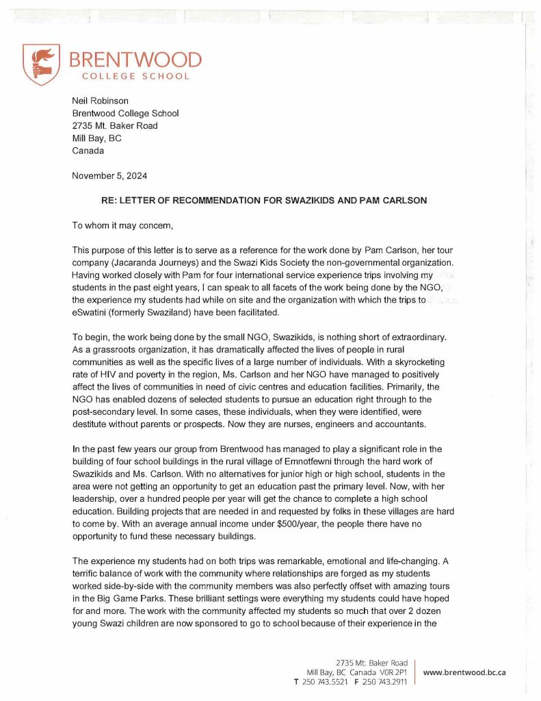 Thank you for all of your work both pre, during and post Swazikids’ service trip with our Brentwood Students. Your attention to every last detail created a magical and authentic experience for them. I appreciate your efforts and look forward to thanking you in person.